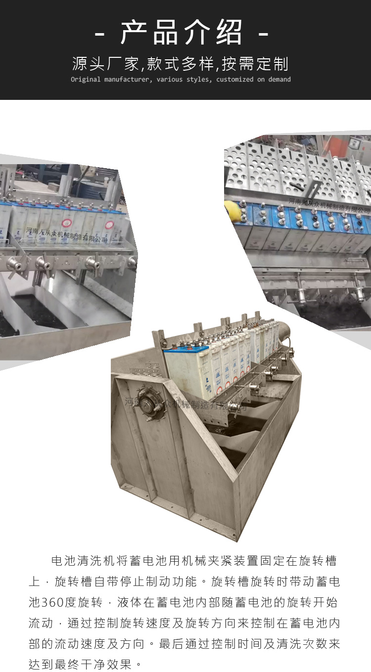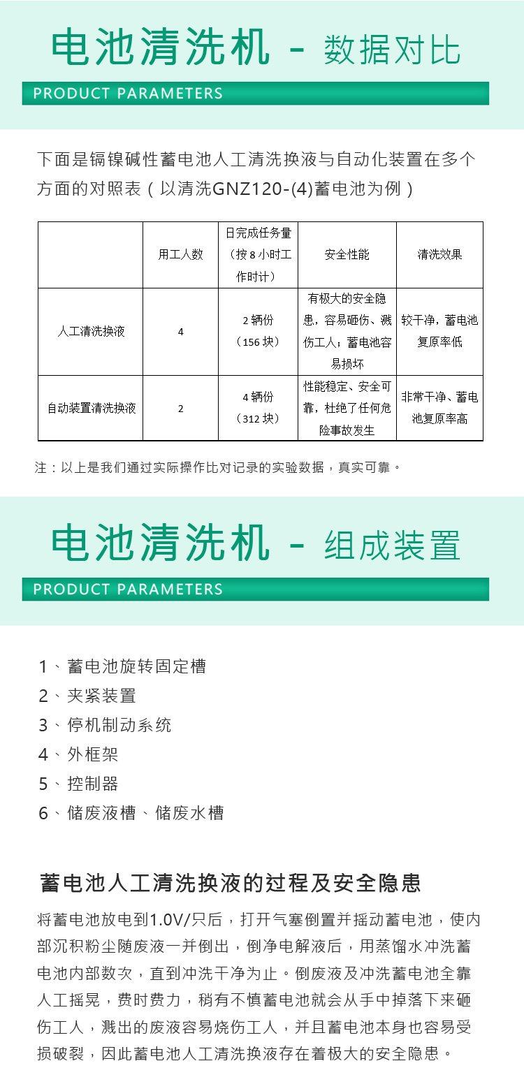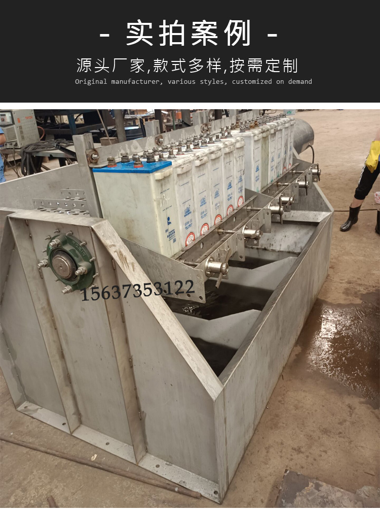 鎘鎳堿性蓄電池清洗換液設備將蓄電池用機械夾緊裝置固定在旋轉槽上,旋轉槽自帶停止制動功能。旋轉槽旋轉時帶動蓄電池360度旋轉,液體在蓄電池內部隨蓄電池的旋轉開始流動,通過控制旋轉速度及旋轉方向來控制在蓄電池內部的流動速度及方向。最后通過控制時間及清洗次數來達到最終干凈效果。對蓄電池的極板無任何損傷,排除了人工清洗的安全隱患。
