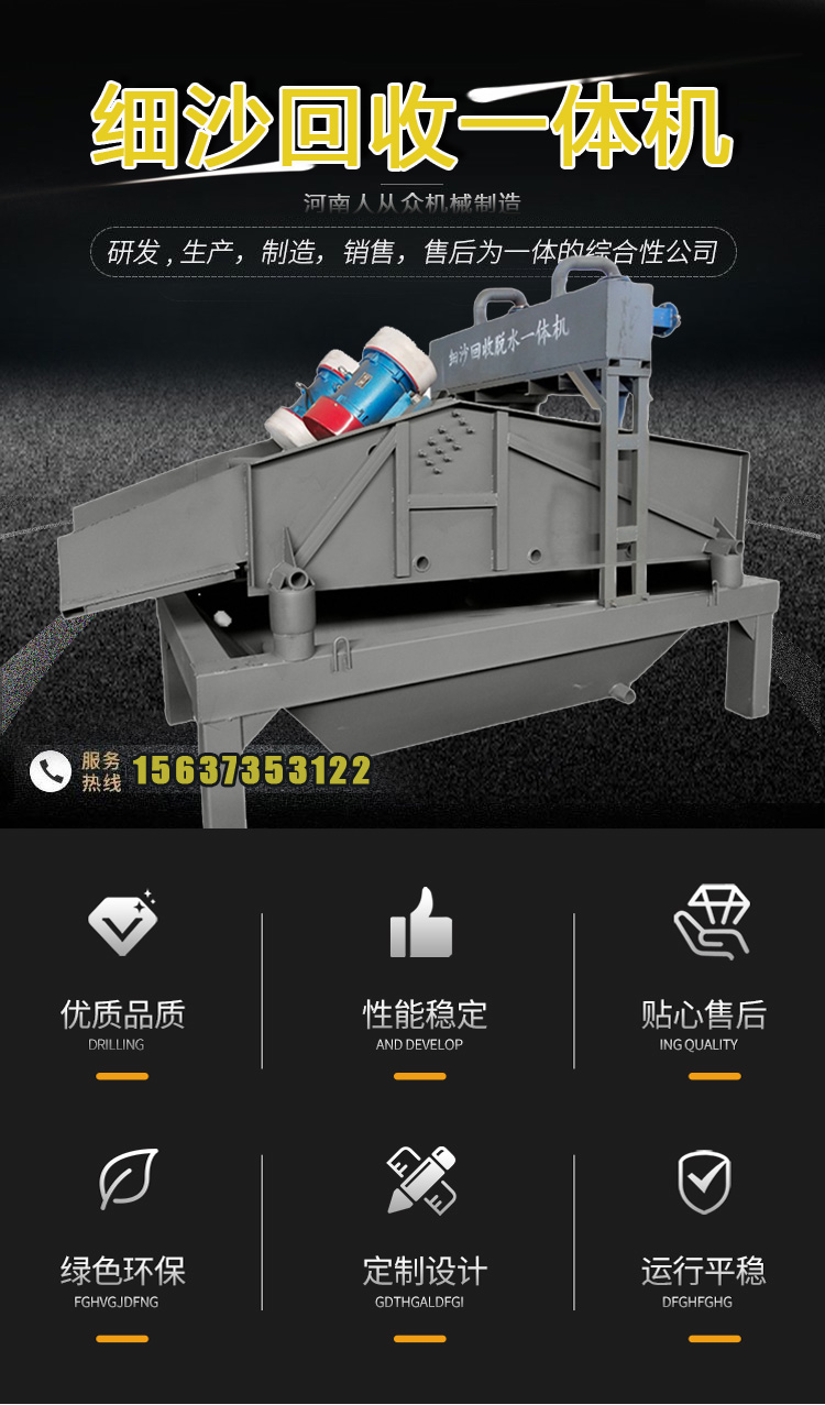 細砂回收脫水一體機可用于砂石料礦山的洗砂、選礦廠的尾礦干排等,其由電機、渣漿泵、旋流器zkr直線振動篩、清洗槽、回流箱等組成,處理能力一般為10-100噸/小時,可根據處理能力定制生產.